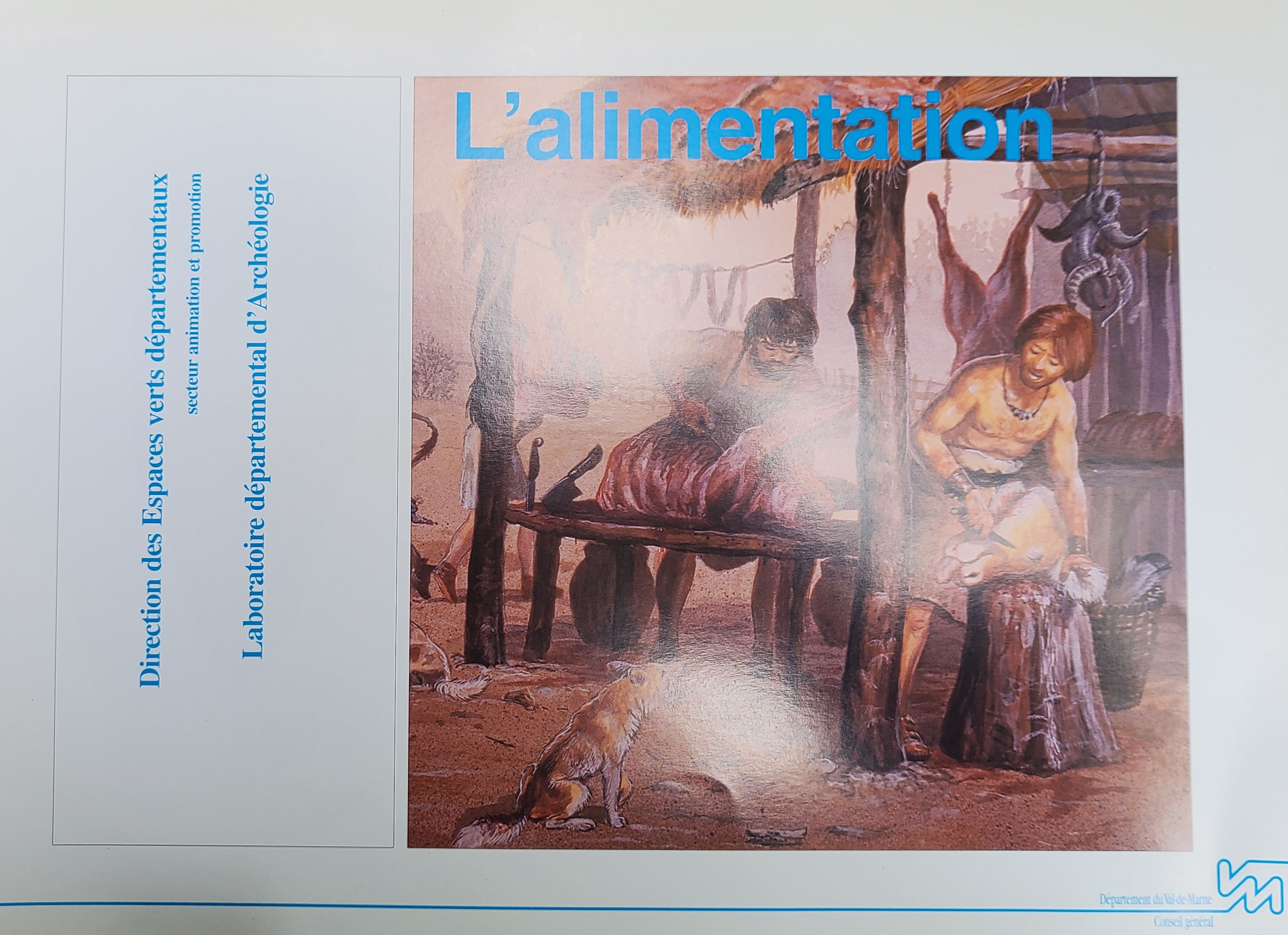 En collaboration avec Philippe Andrieux et la Direction des Espaces verts départementaux, nous avons monté cette exposition sur les régimes alimentaires des hommes préhistoriques. En réalité, le catalogue de l'exposition retrace l'évolution du régime alimentaire par les procédés de la chasse, la cueillette, la pèche qui procurent à l'homme au cours du Paléolithique, une économie de subsistance diversifiée. Au Néolithique, les premiers agriculteurs entament une mutation technique et sociale favorisant les pratiques d'élevage leur procurant une économie de production céréalière, bouchère et laitière. les résultats de ces pratiques sont livrées à partir des nombreux sites fouillés du Val-de-Marne.