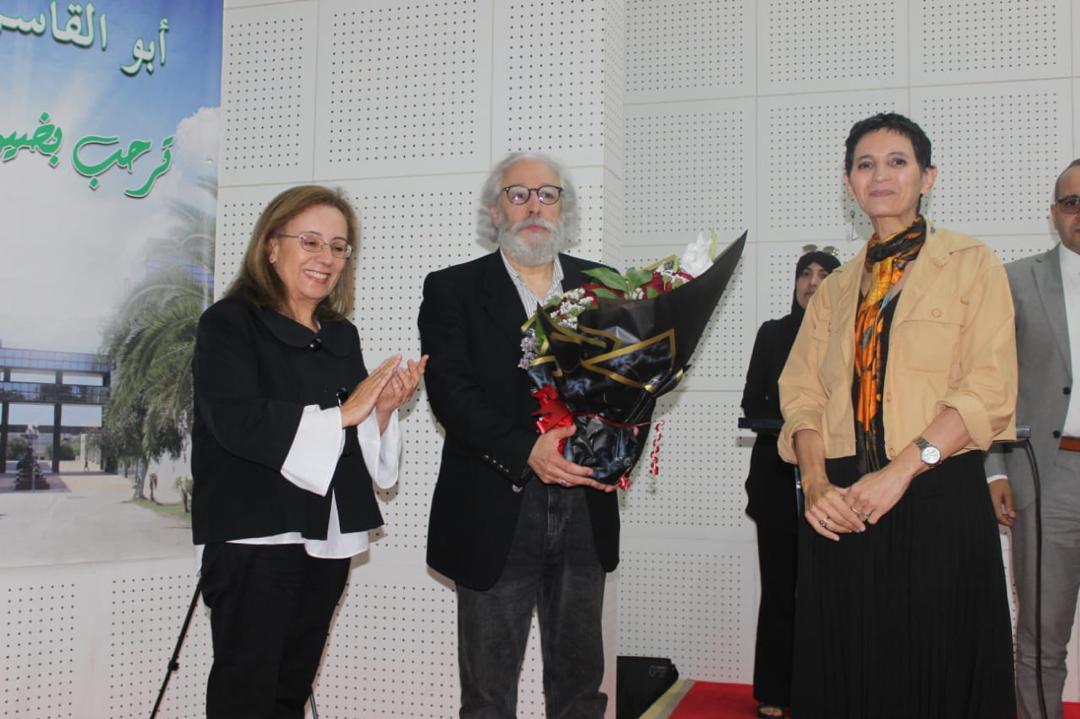 Conférence Institut d’Archéologie, Université 2 Alger. Les Professeurs Chaid-Saoudi Yasmina et Roumane Kahina remettant un bouquet de roses