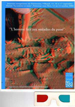 Ce catalogue de 24 pages illustre les grandes maladies qui ont touché les populations du Val-de-Marne, ainsi que les malformations cranio-faciales (asymétries, torsions, torticolis) et occlusales (dysmorphoses dento-squelettiques) et celles qui ont concerné le squelette des membres et du rachis (posturologie, biomécanique fonctionnelle, malformations et déformations rachidiennes). Il est accompagné d'une paire de lunette bicolore afin de voir les photos en relief.